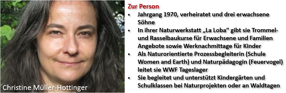 Ein kleiner charmanter Raum dekorativ geschmückt mit Trommeln und Rasseln und allerlei Naturmaterialien, wie Federn, Steine, Wolle, Filz und Perlen, die einer Naturwerkstatt auch ihr geheimnisvolles Aussehen gibt. Christine veranstaltet hier neben ihren Familienangeboten auch Trommelworkshops. Dass es bei ihrem Angebot, einen Sprechstab für Familien zu kreieren, um mehr geht, als nur um reine Bastelarbeit, lässt das Ambiente des Raumes bereits erahnen. Zu anfangs wird man mit dem Räucherduft von Salbei, Beifuss und Holunderblüten gereinigt und die Trommel aus Arvenholz und der Haut einer Steingeiss aus dem Bündnerland, schlägt dazu. Gespannt lauscht man den Worten von Christine.