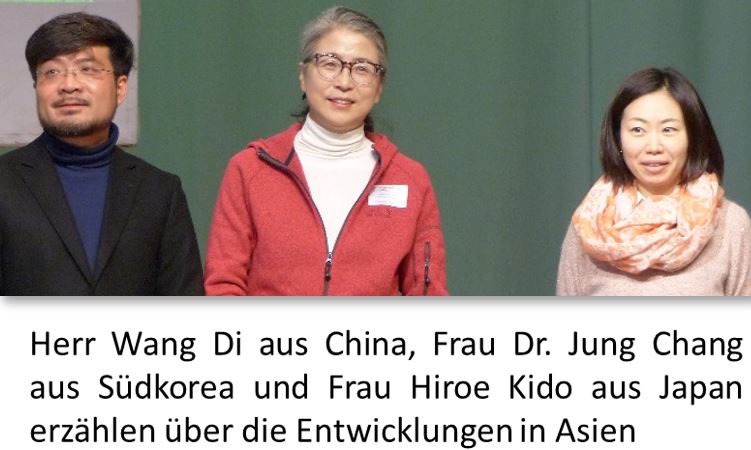 Über die Entwicklungen der Natur- und Waldkindergärten in Asien haben von Frau Dr. Hee Jung Chang aus Südkorea, Herr Wang Di aus China und Frau Hiroe Kido aus Japan anschaulich und informativ über ihre Länder berichtet. Das Konzept der Waldkindergärten verbreitet sich dort weiter. Die ersten Waldkindergärten in Japan entstanden in den 1980er Jahren. Inzwischen hat sich dort ein grosses Waldkindergarten Netzwerk aufgebaut mit landesweit 208 Mitgliedern. Sie verbringen das ganze Jahr täglich in der Natur. Diese Kindergärten werden von privaten freiwilligen Elterngruppen, gemeinnützigen Organisationen oder privaten Kindergärten betrieben.