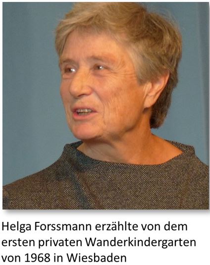 Helga Forssmann nahm alle auf die Reise der Entstehung des ersten Wanderkindergartens in Deutschland mit, der 1968 von Frau Sube gegründet wurde. Amüsiert unterhaltend erzählte Helga Forssmann, wie Frau Sube an ihrem dreiundsiebzigsten Geburtstag ihr morgens sagte: «Nur damit Sie es wissen, heute Mittag sage ich den Eltern, dass Sie ab Montag, den Kindergarten leiten.» Von da an, von 1998 bis heute, leitet Helga Forssmann begeistert und voller Leidenschaft den Wanderkindergarten alleine. Petra Jäger, Gründerin des ersten anerkannten Waldkindergartens Deutschland in Flensburg wird oft gefragt, ob sie nach 25 Jahren noch Leidenschaft verspüre, täglich und bei jeder Wetterlage mit den Kindern in den Wald zu