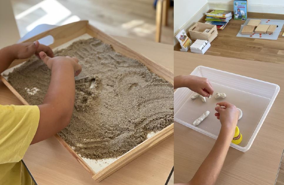 Schreiben wird mit Sand, Knete und Rasierschaum und auf der Tafel und dem Papier gelernt. Die Äpfel im Garten werden geerntet und zu Apfelmus, Apfelringe und Apfelsaft weiter verarbeitet. Kreativ wird mit Karton gebaut und mit Zahnstocher Boote gebaut.