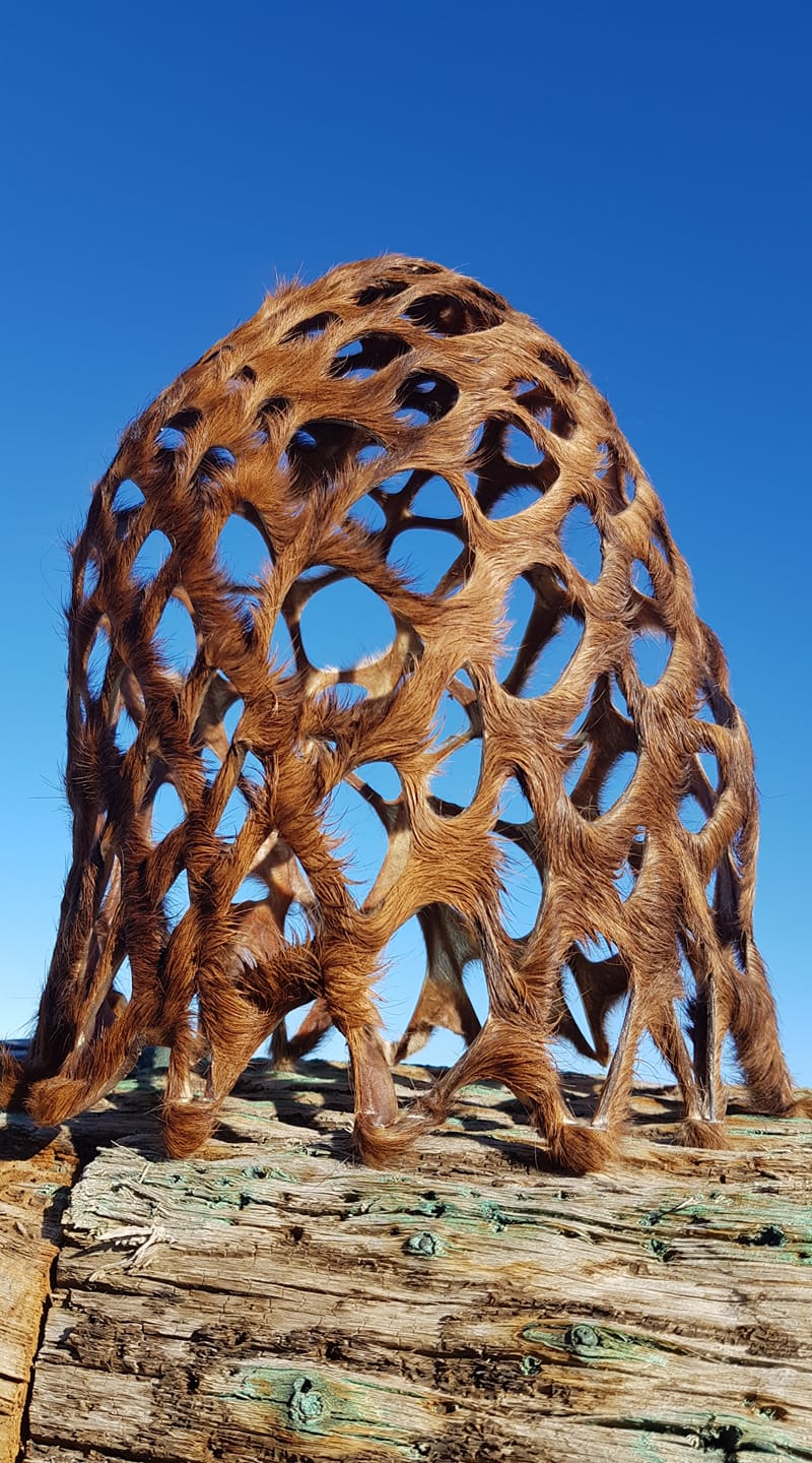 Seit 40 Jahren beschäftige ich mich mit meinen Händen und meinem Geist mit Materialien aus der Natur. Es sind Techniken aus der Vergangenheit, mit Pferdehaaren, Tierfasern, Fellen, Formen und Ideen, die mir erscheinen, wenn ich den Klang unserer Erde höre, das Licht und die Dunkelheit des Tages sehe, die Kälte und die Wärme fühle, die alle den Geist für Kontraste und Neugierde öffnen. Heute spreche ich die Sprache und ich lebe am Meer und meine Augen spielen mit dem Tag, der kommt, wie er kommt. Es gibt Tage ohne gesprochene Worte, die mich nicht stören, denn ich spüre ein anderes Gespräch, das keine Zeit und keine Worte hat. Das Gefühl, mit meinem Geist, meinen Augen, meinen Händen und meinen Ohren zur selben Zeit am selben Projekt zu sein, gibt mir die Möglichkeit, den Moment wahrzunehmen, da zu sein und offen zu sein für das, was auf dem Weg meines Prozesses passieren kann.