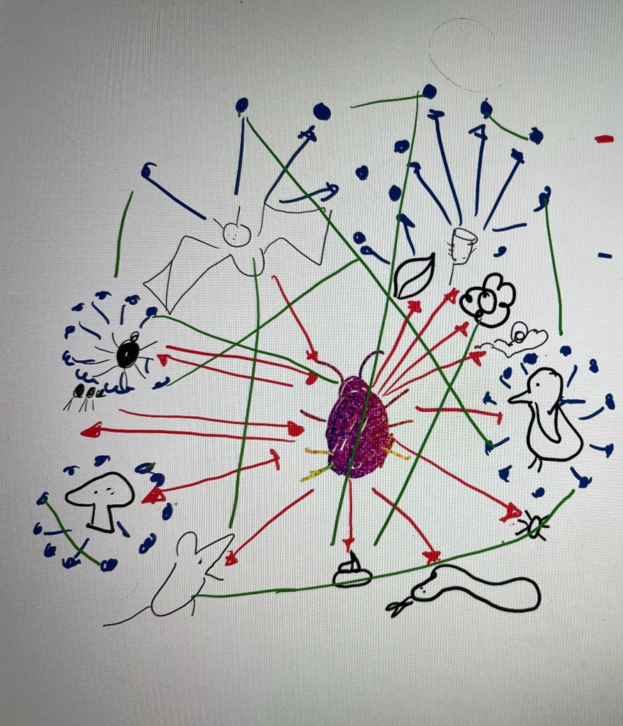 Nehmt ein Blatt Papier und malt euer Lieblingstier in die Mitte. Einen Singvogel, einen Schmetterling. Drumherum malt ihr dann alles, was das Tierchen frisst, von wem es gefressen wird, was mit seinen Hinterlassenschaften passiert. Muss gar nicht fachlich korrekt vollständig sein, aber da kommen dann einiges an Pflanzen, Insekten, Raubtierchen und Mikroben zusammen. Und für alle diese Lebewesen macht man dann das gleiche … so habe ich die Skizzen gemacht für das Buch – und war schnell bei den wirrsten Grafiken der Welt.