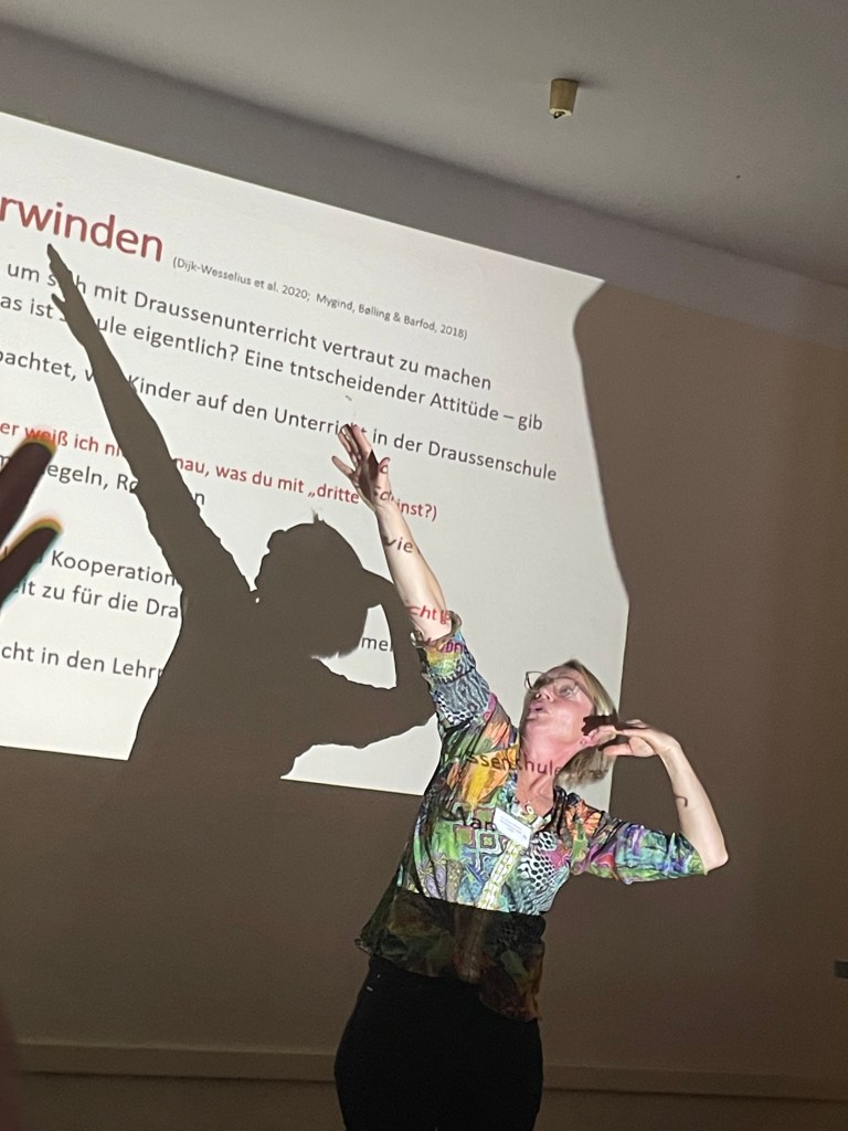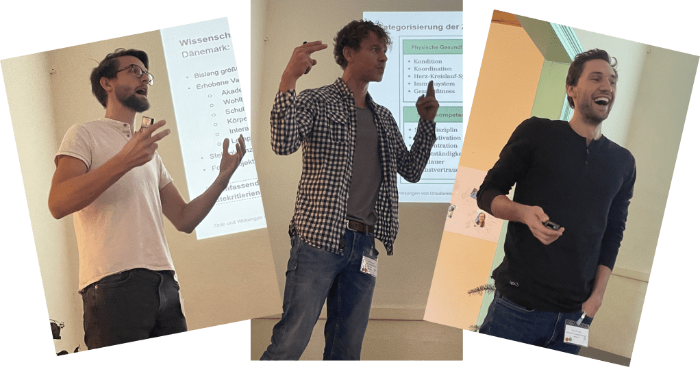 Im Eröffnungsvortrag am Donnerstagnachmittag hat Dr. Karen Barfod vom VIA University College aus Dänemark den Weg der dänischen “Udeskole” aufgezeigt. Dabei hat sie sich vor allem der Frage gewidmet, wie es Dänemark geschafft hat, dass an über einem Viertel aller Schulen regelmäßig und obligatorisch draußen unterrichtet wird. Erfrischt von ihrem lebhaften und motivierenden Vortrag hatten die Teilnehmenden danach bei einem Speed-Dating die Gelegenheit, erste Kontakte zu ihr oder allen anderen zu knüpfen. Die Verbindung zur Wissenschaft zu pflegen und fördern, ist für die Netzwerkarbeit ungemein wichtig, was sich in der zweiten Keynote am Freitagvormittag spiegelte: Dr. Jakob von Au, Dr. Christoph Mall und Jan Ellinger luden bei ihrem Forschungsüberblick zu „Zielen und Wirkungen von Draußen-Lernen und Draußen-Unterricht“ dazu ein, die Thematik Draußen-Schule auch kritisch zu betrachten und wissenschaftlich zu untersuchen. Sie zeigten, dass es wichtig ist, genau hinzuschauen und dass es nicht ausreicht, positive Konsequenzen von Draußen-Unterricht zu erwarten oder als „automatisch gegeben“ anzusehen.