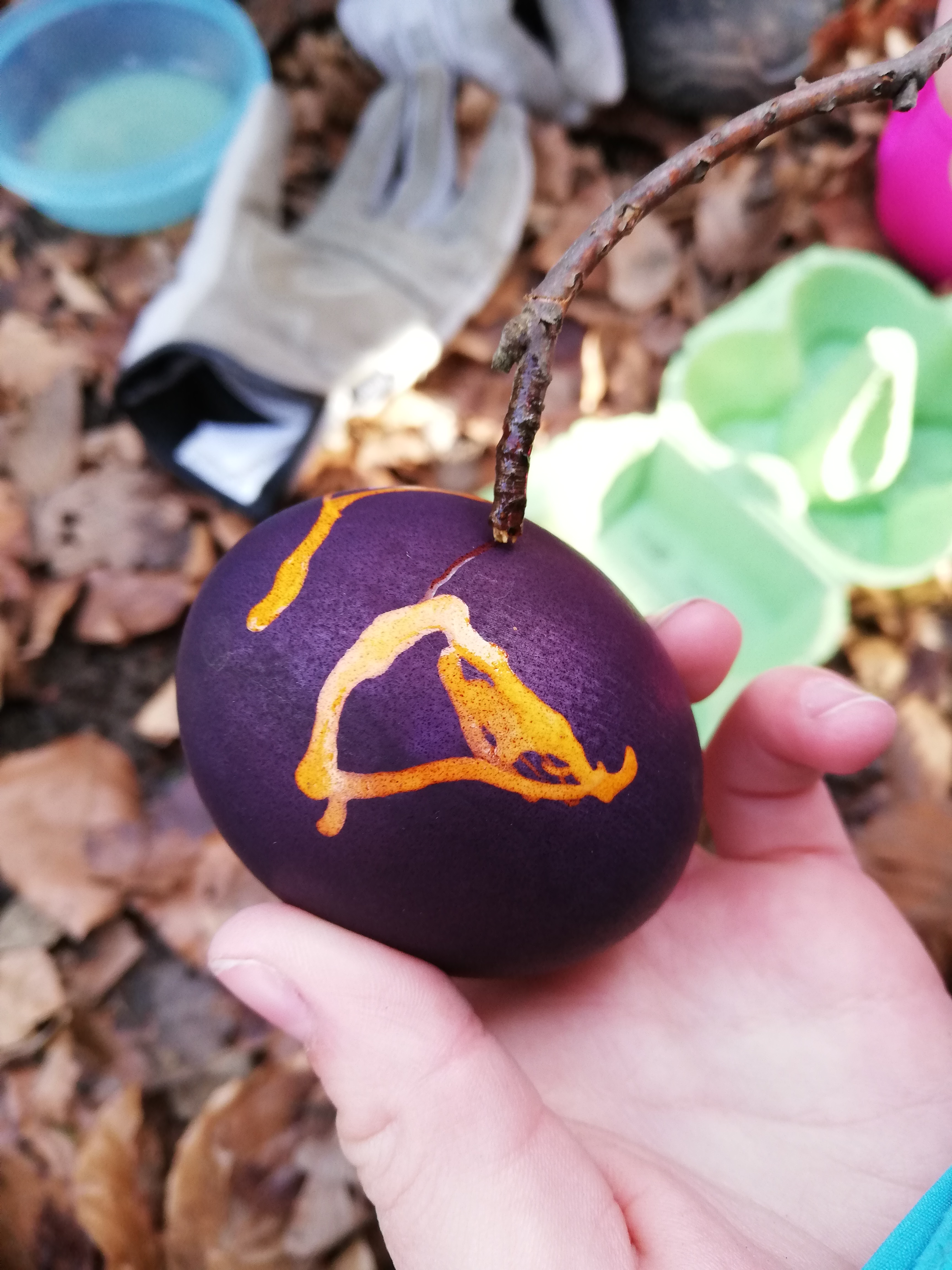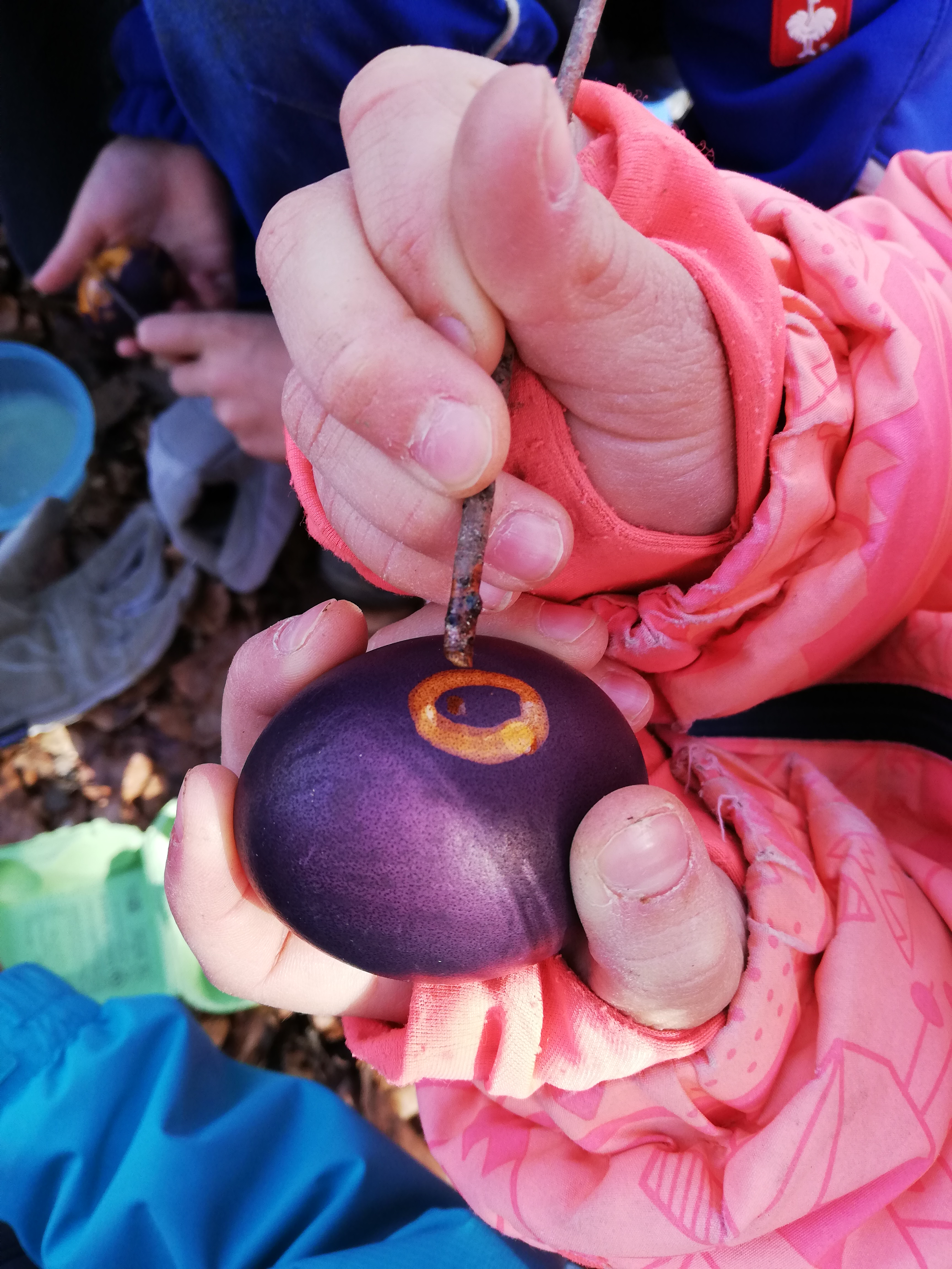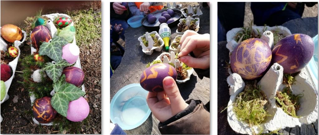 Damit die Kinder beim Ostereier färben viel selber machen können, haben sich im Wald für uns zwei Praktiken bewährt.