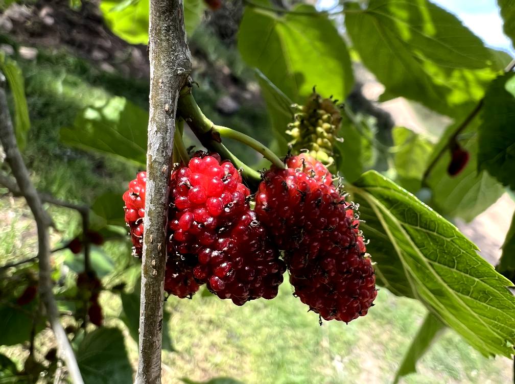 Hast du einen Garten, kannst du ihn pflanzen. Dass sie so leicht Wurzeln schlagen, zeigt die grosse Lebenskraft und Regenerationsfähigkeit der Maulbeerbäume. Sie sind unkompliziert im Anbau, besitzen rasche Wüchigskeit. Ein im Juli oder August in die Erde gesteckter Steckling hat gute Chancen, zu einem Baum heranzuwachsen. Es gibt auch kleinere Sorten, die weniger Platz beanspruchen. Der Baum wird dich mit Schönheit, Heilung und köstlichen Beeren versorgen. Die Maulbeerfrüchte reifen nicht alle zur gleichen Zeit, sie müssen nach und nach geerntet werden. So hält der Baum während der Fruchtreife seinen Freundeskreis bei der Stange.