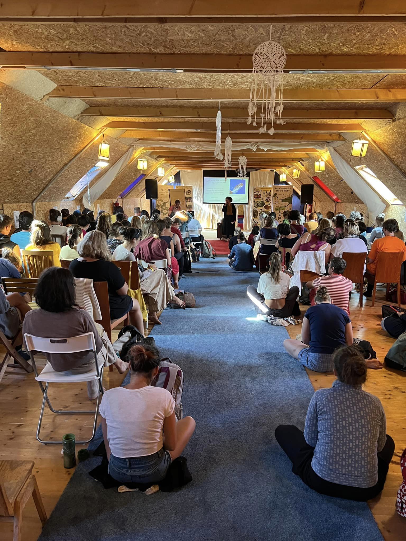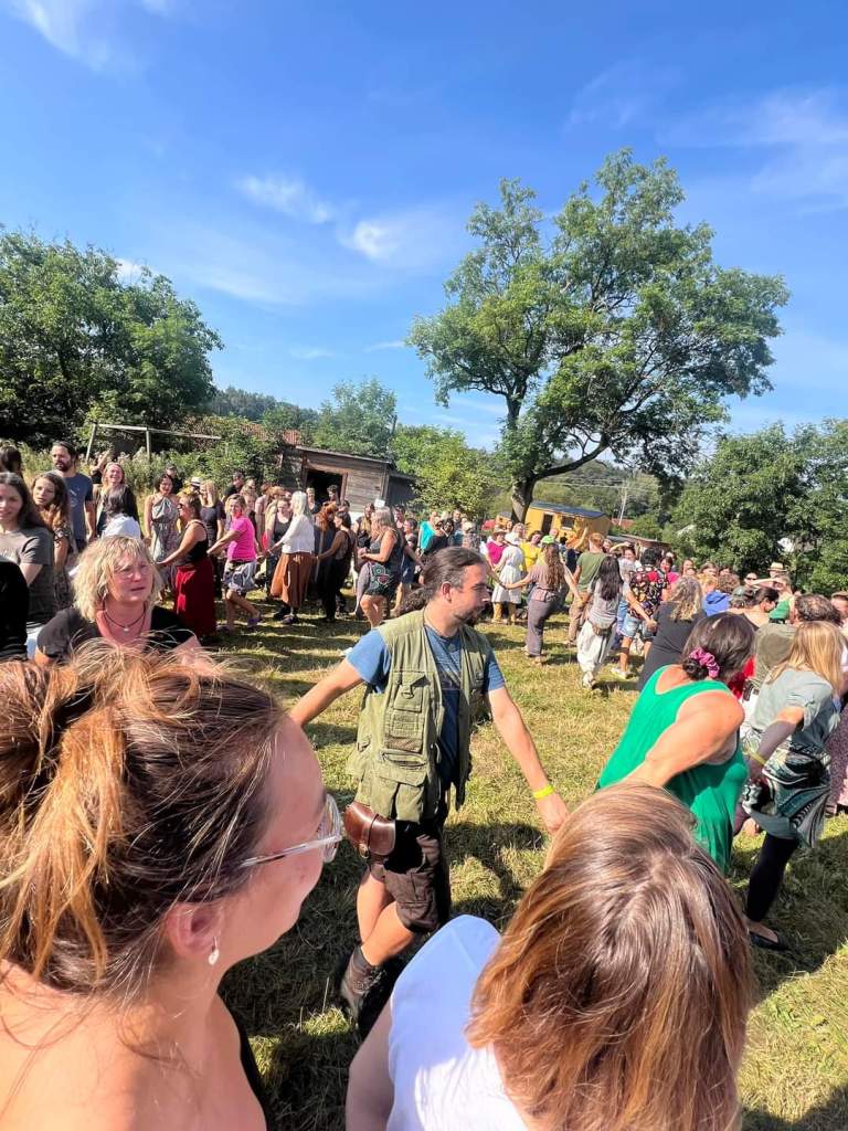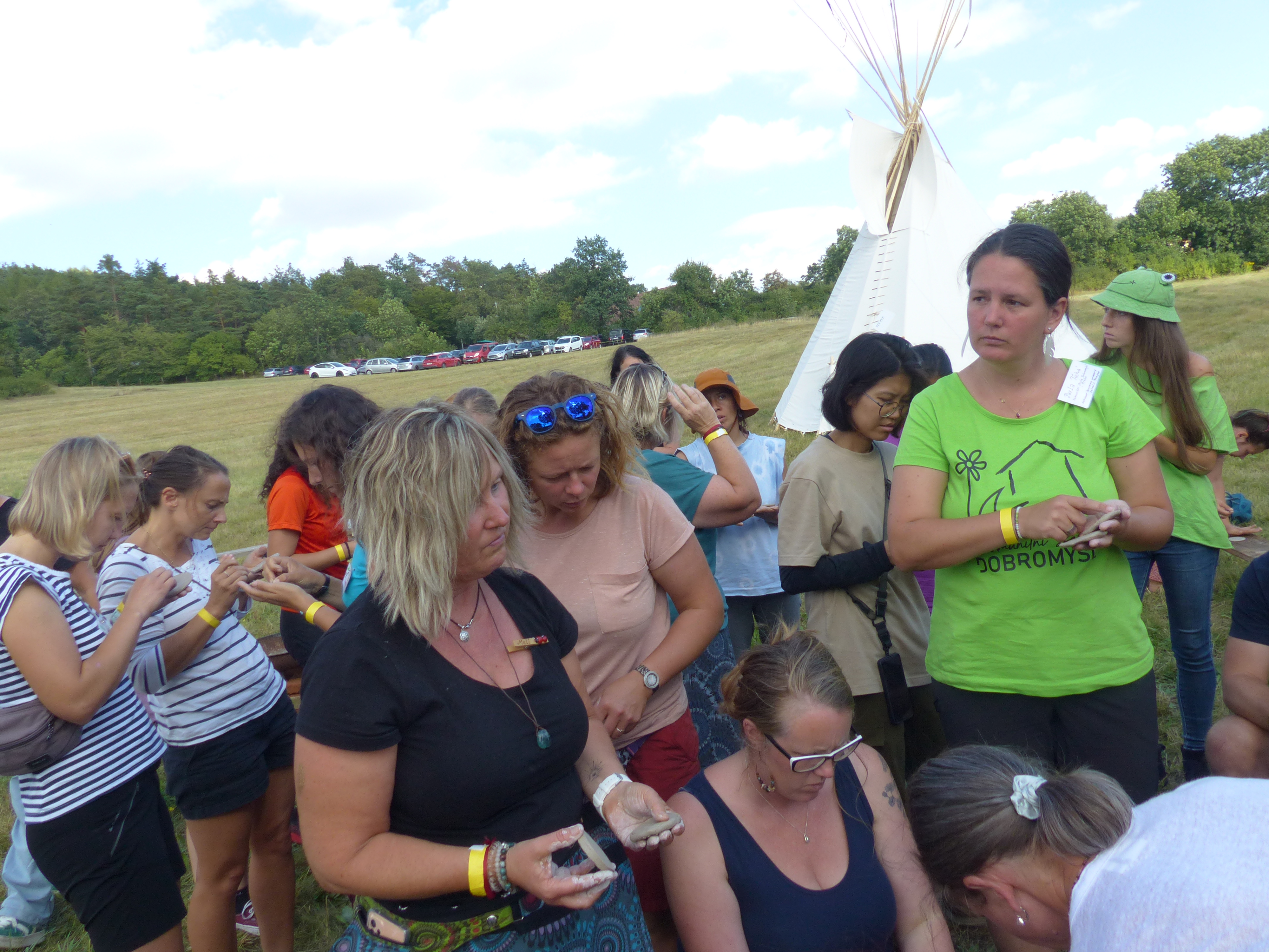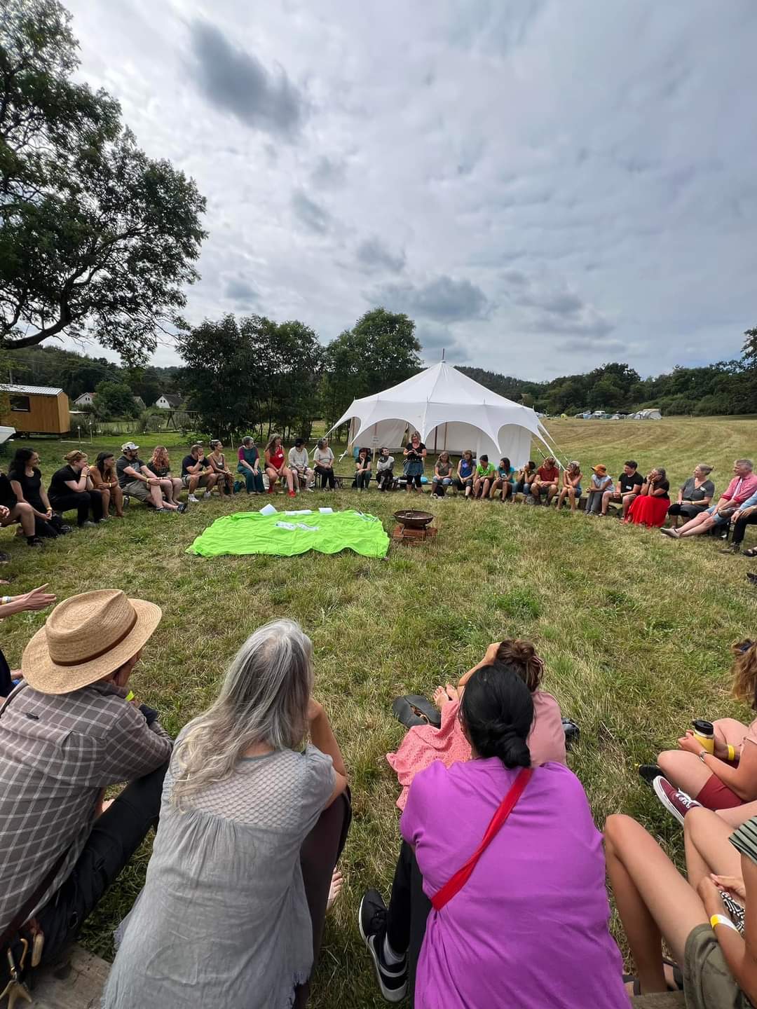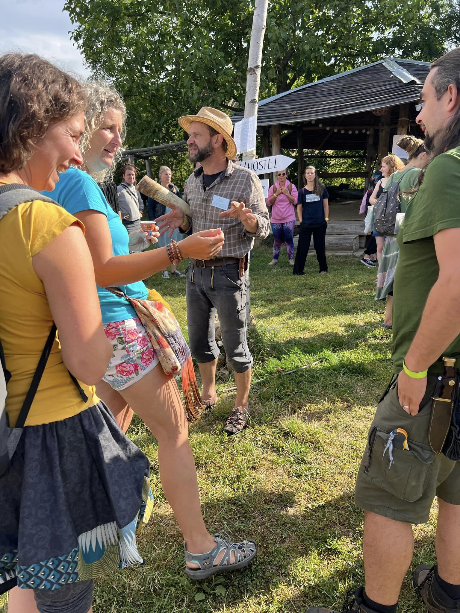 The latest event, held on August 5-8, 2024, was organized in cooperation with the movement „Children of Nature Worldwide Hand in Hand“ and it has truly grown to be a global venue, with over 200 participants from twenty nations gathered to exchange knowledge, experiences, and feelings about nature, childhood, and education, with the presence of well-known educators, speakers and authors from Europe and the USA. The programme was filled to the brim with interesting presentations, lively group discussions, exciting workshops, parallel activities, and beautifully prepared halls and tents. Handcrafted products, cosmetics, clothes, books, and jewellery were offered for sale and the food and drinks provided by the organizers as well as other invited suppliers were of excellent quality. The morning singing and the evenings around the fire only added an extra dimension of warmth and coziness. Despite the high level of the activities offered, the atmosphere was relaxed, and everybody had the opportunity to meet, discuss, and enjoy together, regardless of age, status, or interests. Held in the Loutí Ekocentrum, not far from Prague, the venue could not be more appropriate for the task at hand. The estate is crowned by two towering oak trees that draw the attention of all and have hosted activities under their leaves. Participants could also join workshops in different forested areas and, weather permitting, swim in the Moldava River. The short week spent in Loutí felt almost like a retreat from the daily hustle and bustle and allowed me to meet old and new friends, learn new ideas and skills, and find like-minded people in a calm, creative, and heartwarming setting.”